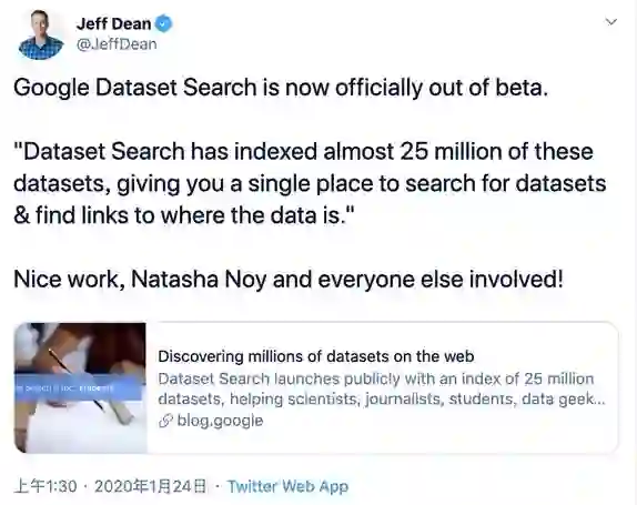 近日,谷歌宣布,它们的数据集搜索引擎不再是 beta 版了。这意味着该产品已经正式向用户们开放使用。Jeff Dean 和谷歌官方都在推特上宣布了这一消息。