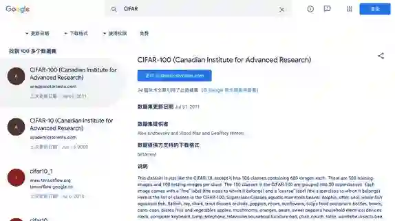 机器之心尝试了这一数据集搜索工具。例如,我们在搜索栏里输入了 CIFAR,搜索引擎很容易就提供了 CIFAR-10 和 CIFAR-100 两个数据集的搜索结果,并附带数据集全名、被引用数量、更新时间、提供者、下载方式、介绍和信息来源等。