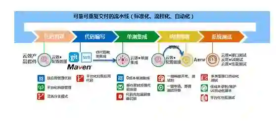 云效持续交付解决方案:所有应用24小时随时提测并发布,无发布窗口限制;预发布集成环境,半小时完成自动化并无人值守。