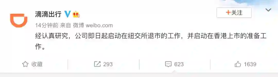 12 月 3 日,滴滴出行官方微博发布消息称,经认真研究,公司即日起启动在纽交所退市的工作,并启动在香港上市的准备工作。