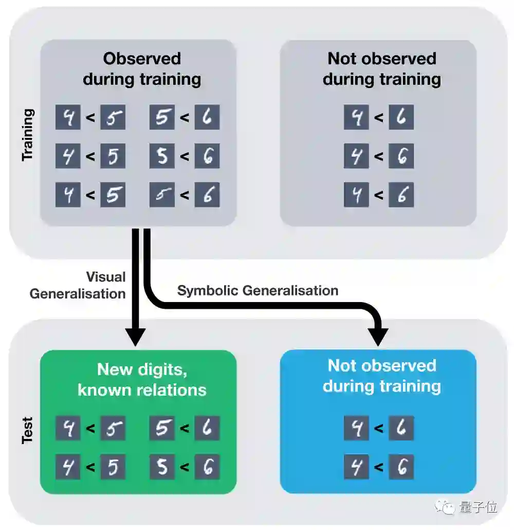 但实际上,只有每对数字你都给它多个样例,它才能正确地泛化。这个模型擅长视觉上的泛化,比如说测试集中的每一对数字它都见过了,要泛化到新的图像,就很容易(见下图绿色方块)。但它不适用于符号的泛化,比如说它就不能泛化到从未见过的数字(见下图蓝色方块)。