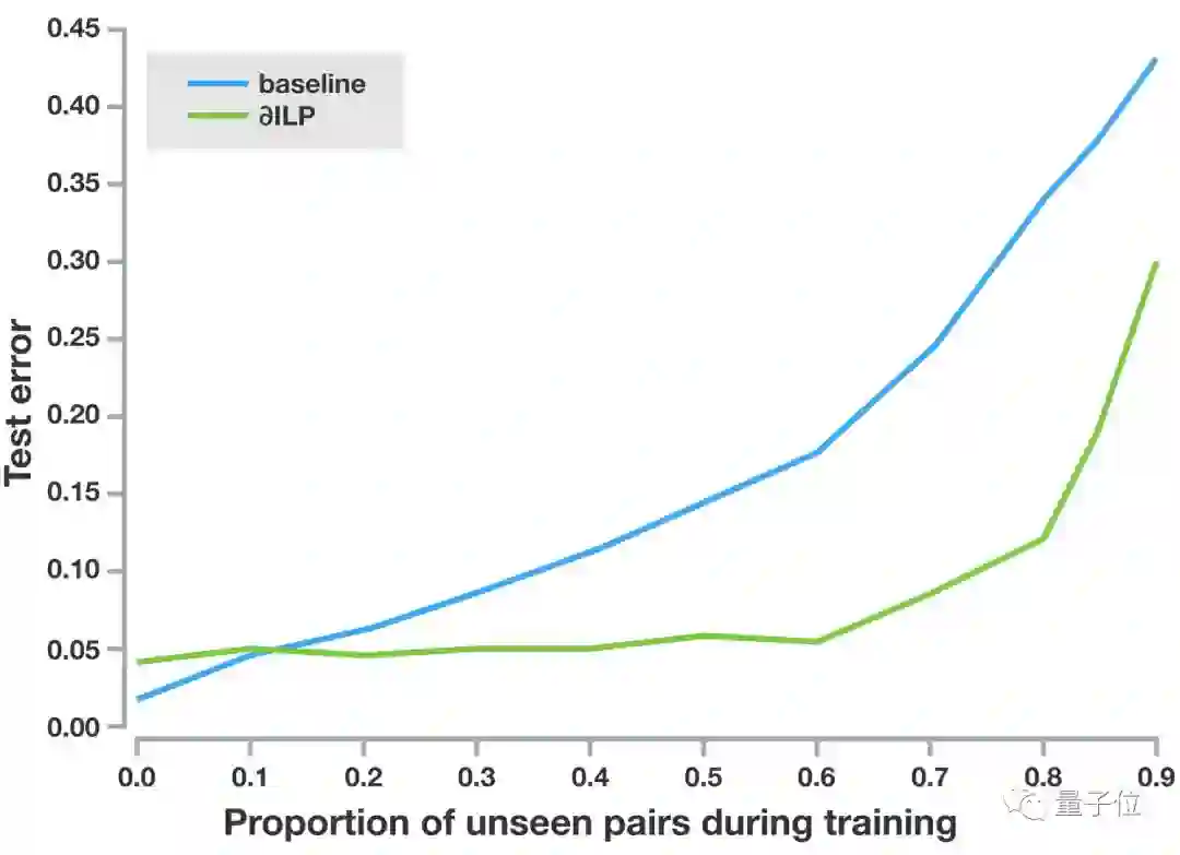 上图总结了我们的“小于”实验:蓝色曲线表示标准的深度神经网络,无法正确泛化到从未见过的数字对,相比之下,在只用40%数字对训练过的情况下,绿色曲线表示的∂ILP依然能保持较低的测试误差。这表明,∂ILP能够进行符号性的泛化。