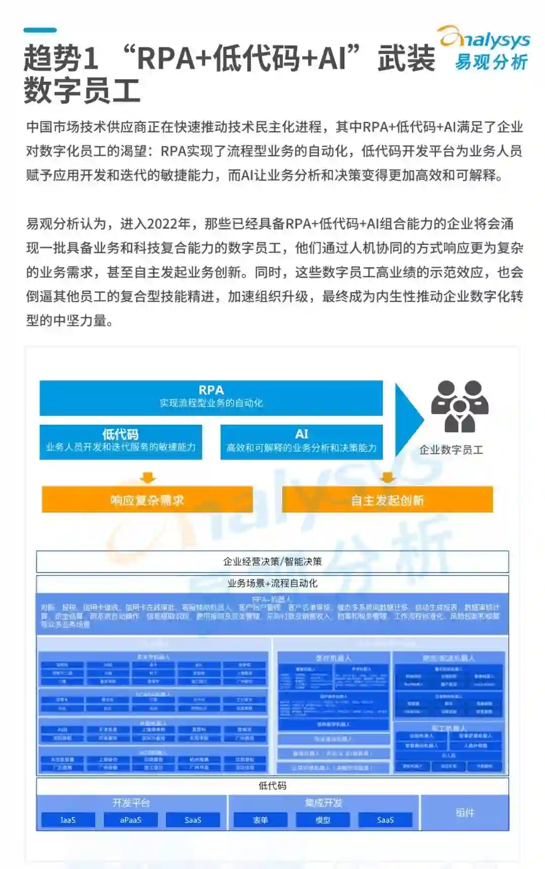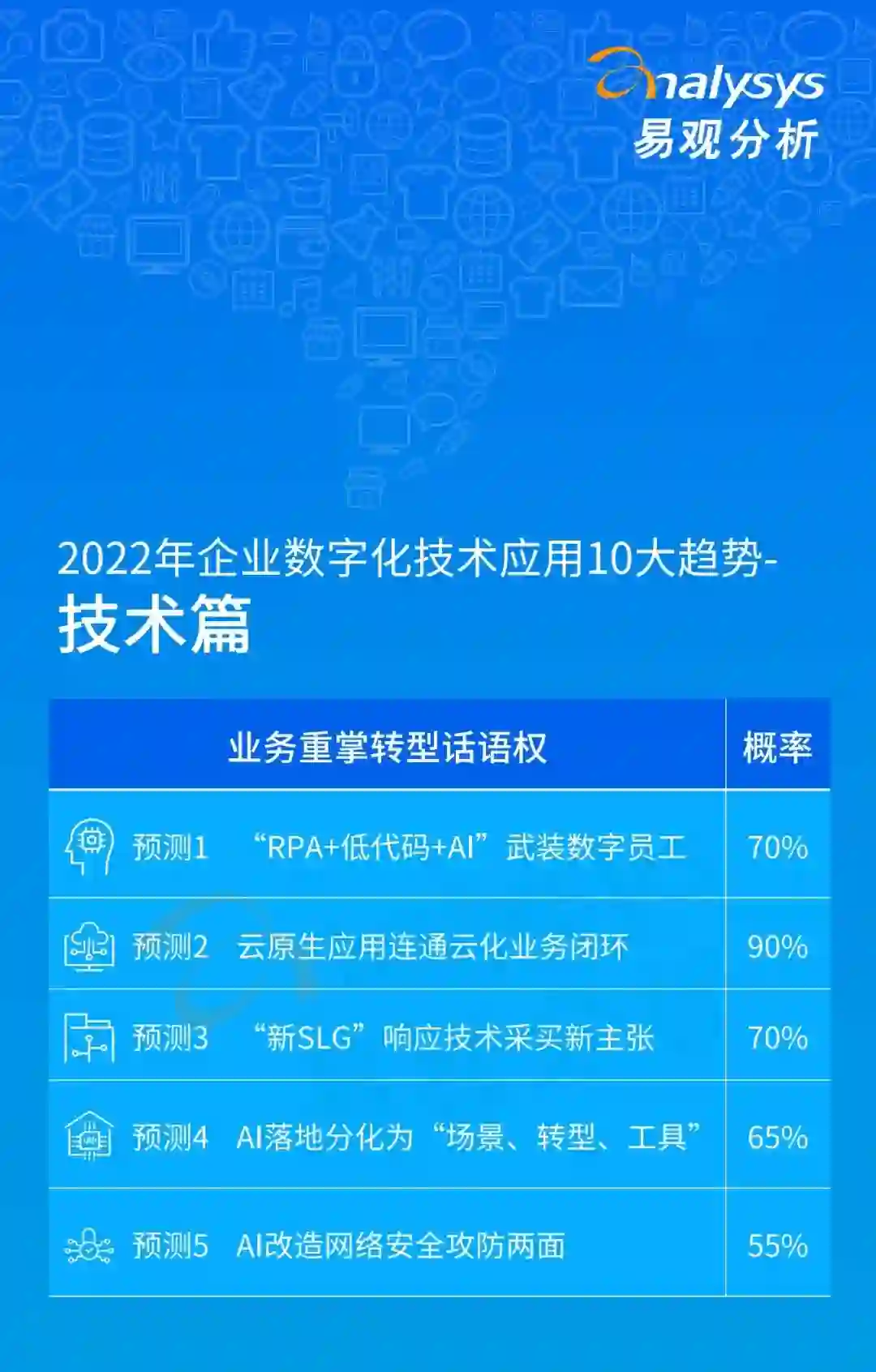 2022年,云原生、RPA、 低代码、微服务、自动化机器学习平台等低门门槛的数智化平台和工具将加速被企业客户所认可和采用,背后原因是企业必须显著降低数字化赋能业务组织的技术门槛,才能让掌舵转型的业务团队“武装起来”,进而让创新有机会由点及面,全面发生。