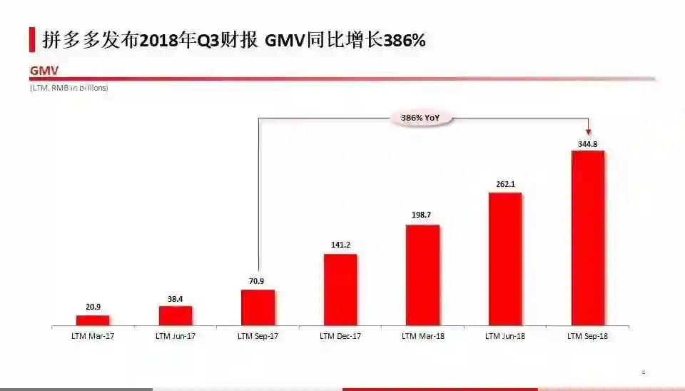 截至2018年9月30日的12个月期间,拼多多平台GMV达3448亿人民币,较去年同期增长386%;年度活跃买家数为3.855亿,较去年同期增长144%。