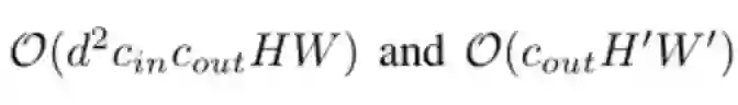 我们注意到使用互相关运算还是L1距离都可以完成相似性度量,但二者的输出结果还是有一些差别的。通过卷积核完成输入特征图谱的加权和计算,结果可正可负;但adder filter输出的结果恒为负,为此作者引入了batch normalization将结果归一化到一定范围区间内从而保证传统CNN使用的激活函数在此依旧可以正常使用。虽然BN的引入也有乘法操作但计算复杂度已远低于常规卷积层。conv和BN的计算复杂度分别如下: