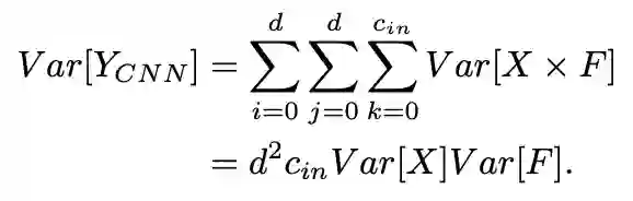 在传统的CNN中,假设权值和输入特征是独立的,服从正态分布,输出的方差大致可以估计为: