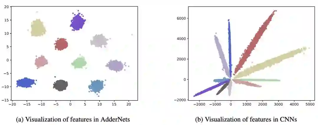 不同类别的CNN特征按其角度来划分。由于AdderNet使用L1范数来区分不同的类,因此AdderNet的特征倾向于聚集到不同的类中心。