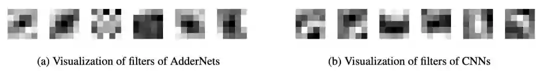 对filter的可视化结果如上图所示,虽然AdderNet和CNN用的度量矩阵不同,但都具有特征提取的能力。