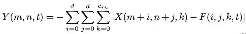 实际上二者的相似性度量可以有多种途径,但都涉及到大量的乘法运算,这就增加了计算开销。因此作者通过计算L1距离完成输入和filter之间的相似性度量。而L1距离仅涉及到两个向量差的绝对值,这样输出就变成了如下: