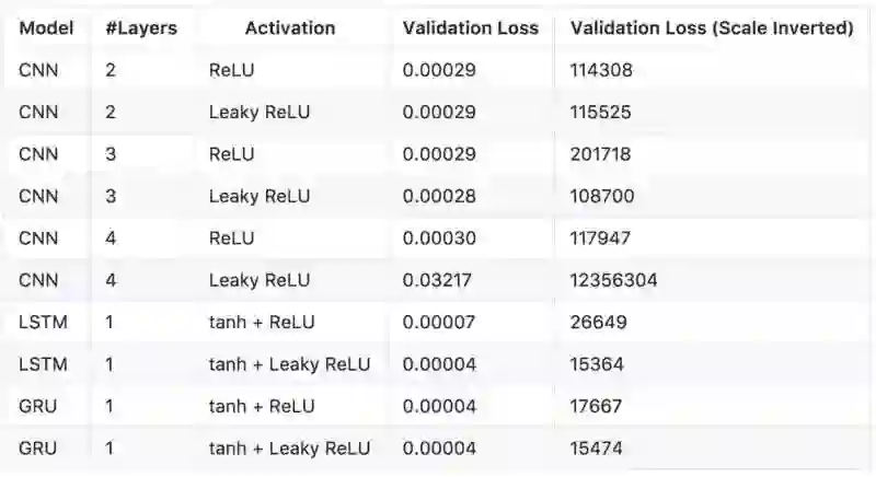 上表中的每一行都是从总共 100 个训练 epoch 中导出的最佳验证损失(validation loss)的模型。从以上结果可以看出,LeakyReLU 似乎总是比正规的 ReLU 产生更好的损失(loss)。但是,使用 Leaky ReLU 作为激活函数的 4 层 CNN 会造成较大的验证损失。这可能是由于模型的错误部署造成的,对此可能需要进行重新的验证(re-validation)。CNN 模型可以训练得非常快(用 GPU,2 秒 /epoch),性能比 LSTM 和 GRU 稍差。 最好的模式似乎是 LSTM tanh 和 Leaky ReLU 作为激活函数,虽然 3 层 CNN 似乎能更好地捕捉局部临时的数据依赖性。