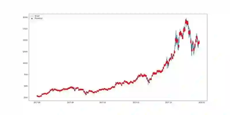 建立两个 Dataframe 用于比特币的市场实际价格和预测价格。出于可视化的目的,绘制的数字仅显示了 2017 年 8 月之后的数据。
