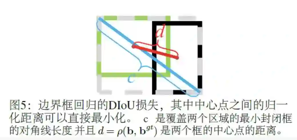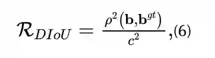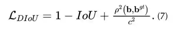 其中 和 分别代表 和 的中心点。 为欧氏距离, 是覆盖两个盒框的最小封闭框的对角线长度。DIoU损失函数可以定义为:
