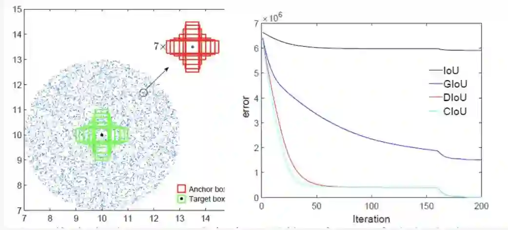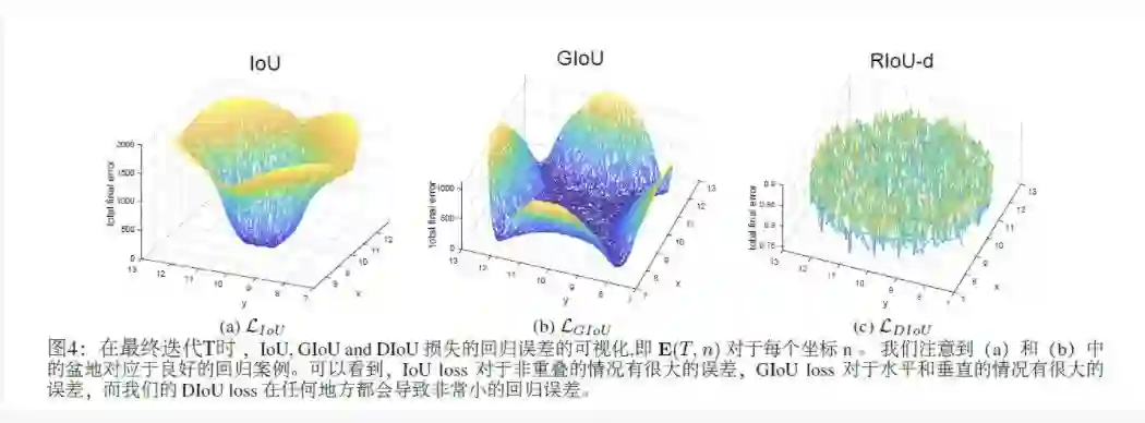 其中 是迭代 时的预测框, 表示损失的梯度。 感觉可以理解为学习率。值得注意的是, 在我们的实现中, 梯度乘以 去加速收敛。边界框回归的性能评估通过使用 . 对于每个损失函数,仿真模拟实验当达到迭代 时,误差曲线如 图 . 所示。