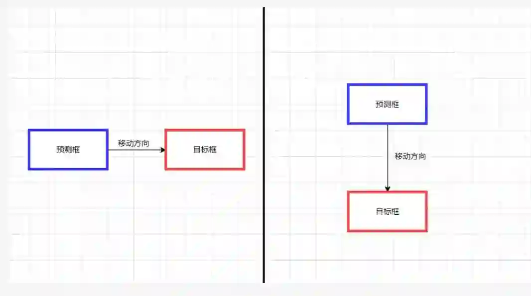 有明显的缺陷 IoU loss只在边界框有重叠时才能工作, 对于不重叠的情况不会提供任何移动梯度 (移动代表预测框朝着目标框重叠的方向移动) 。移动梯度表示无法衡量完全不相交的两个框所产生的的损失(iou固定为0),和两个不同形状的预测框可能产生相同的loss(相同的iou)分别如下图的左边和右边所示。