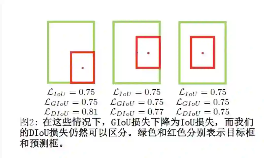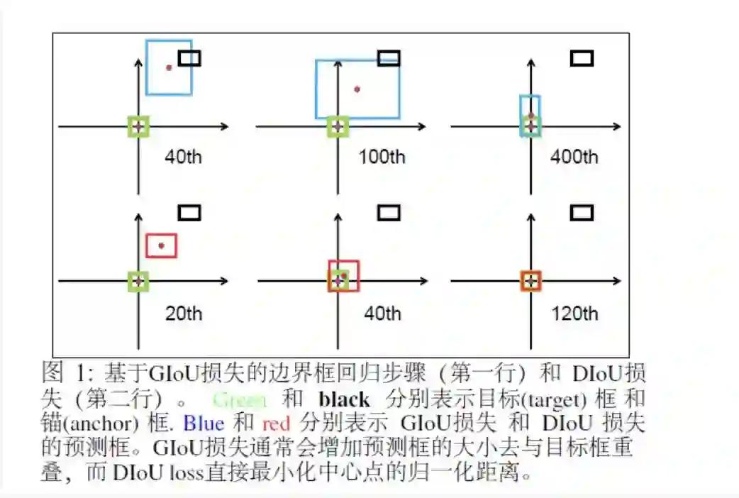 综上所述,在非重叠情况下,IoU损失收敛是糟糕的解决方式,而GIoU损失收敛速度较慢,特别是对于水平和垂直方向的框。在目标检测流程中,IoU和GIoU的损失都不能保证回归的准确性。