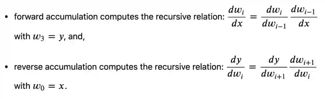 一般而言会存在两种不同的自动微分模式,即前向累积梯度(前向模式)和反向累计梯度(反向模式)。前向累积会指定从内到外的链式法则遍历路径,即先计算 d_w1/d_x,再计算 d_w2/d_w1,最后计算 dy/dw_2。