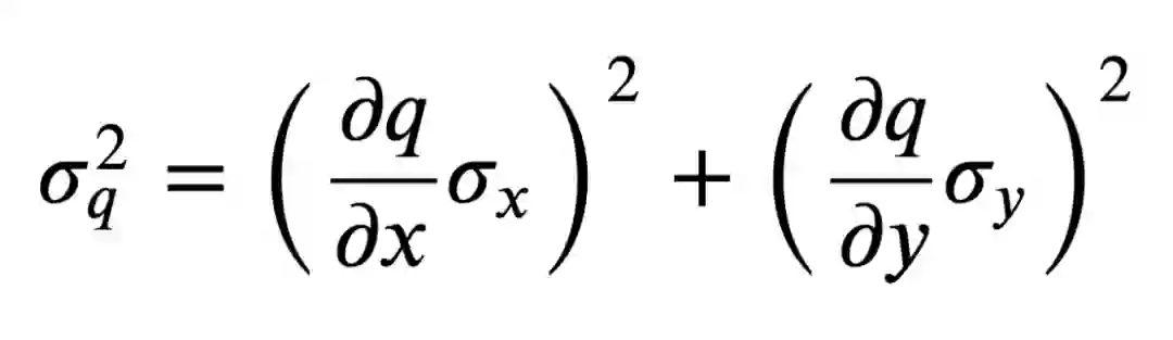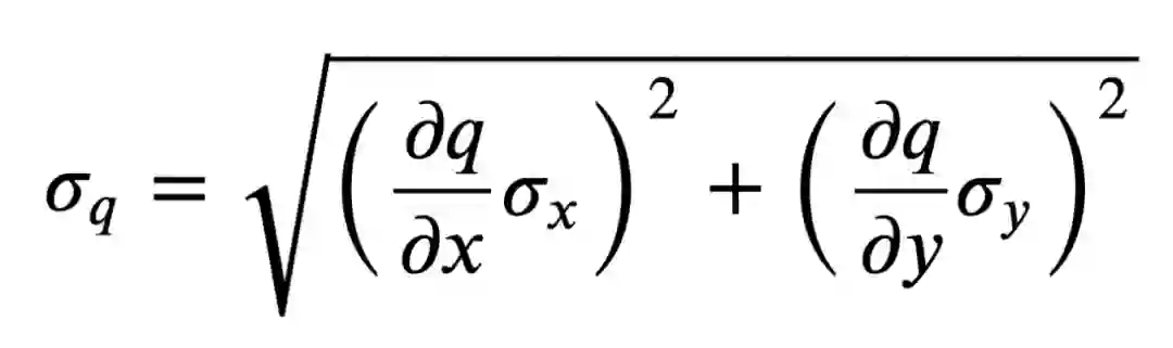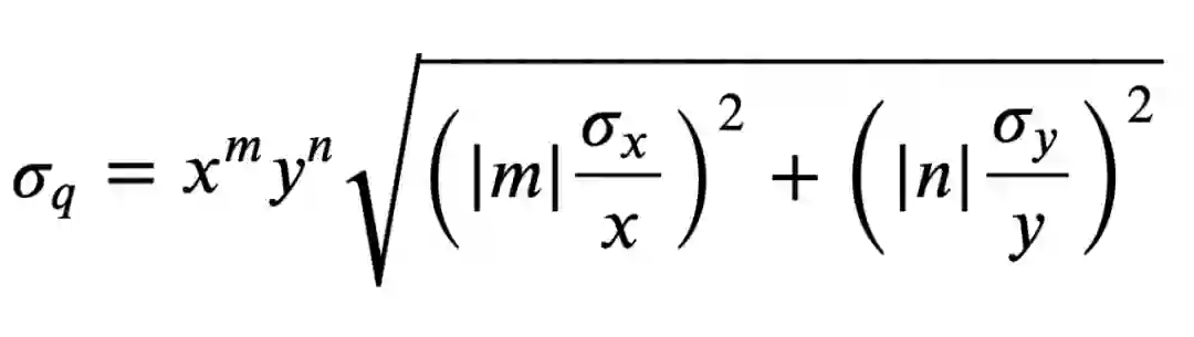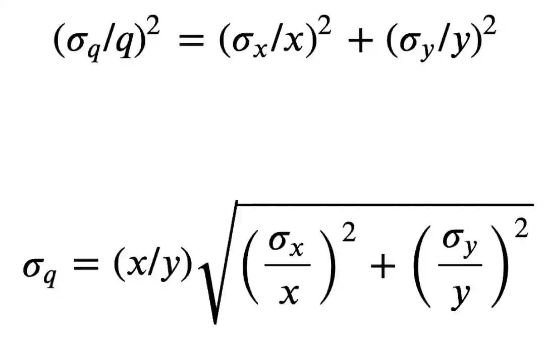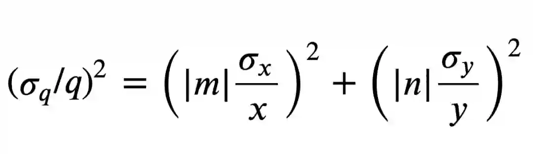 对于特例 q(x,y)=xy 与 q(x,y)=x/y ,不确定性分别为 (σ_q/q)^2 = (σ_x/x)^2+(σ_y/y)^2 与 σ_q=(x/y)* sqrt((σ_x/x)^2+(σ_y/y)^2)。