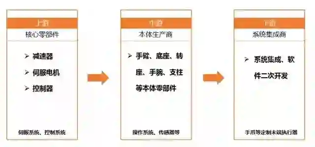 产业链方面,工业机器人行业按产业链分为上游、中游和下游。上游生产核心零部件:包括减速器、伺服系统、控制器;中游是本体生产商,包括工业机器人本体。下游是系统集成商,包括单项系统集成商、综合系统集成商。