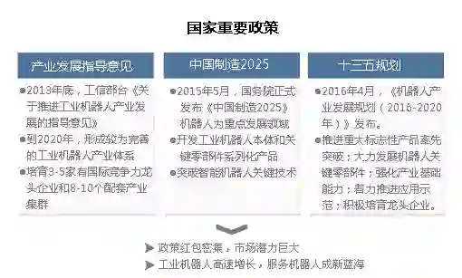 在《中国制造2025》规划中,机器人与高档数控机床被列为政府需大力推动实现突破发展的十大重点领域。2016年工业和信息化部、国家发改委、财政部联合发布了《机器人产业发展规划(2016-2020年)》。《规划》针对我国机器人产业现状,目标为经过五年的努力,形成较为完善的机器人产业体系。技术创新能力和国际竞争能力明显增强,产品性能和质量达到国际同类水平,关键零部件取得重大突破,基本满足市场需求。同时,《规划》提出到2020年,我国自主品牌工业机器人年产量达到10万台,六轴及以上工业机器人年产量达到5万台以上;工业机器人速度、载荷、精度、自重比等主要技术指标达到国外同类产品水平,平均无故障时间(MTBF)达到8万小时;机器人用精密减速器、伺服电机及驱动器、控制器的性能、精度、可靠性达到国外同类产品水平,在六轴及以上工业机器人中实现批量应用,市场占有率达到50%以上;完成30个以上典型领域机器人综合应用解决方案,并形成相应的标准和规范,实现机器人在重点行业的规模化应用,机器人密度达到150以上。