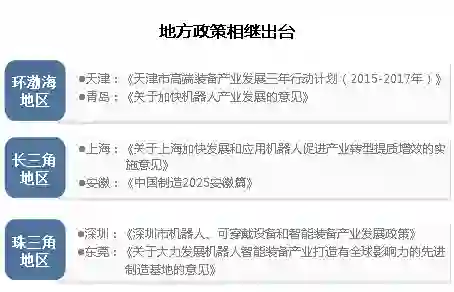 同时,环渤海、长三角、珠三角等地区也纷纷出台相应政策支持机器人产业发展。