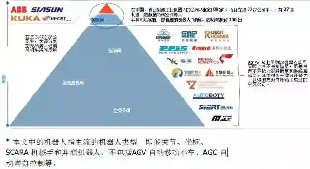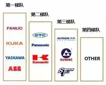 如果把目前市场分成四个体队,那第一梯队毫无疑问为机器人四大家族(ABB(Asea BrownBoveri Ltd)、库卡(KUKA)、发那科(FANUC)、安川电机(YASKAWA)),第二梯队为欧地希、松下、川崎重工等老牌企业,第三梯队为新松、广州数控、广州起凡等国内较为知名的机器人厂商。