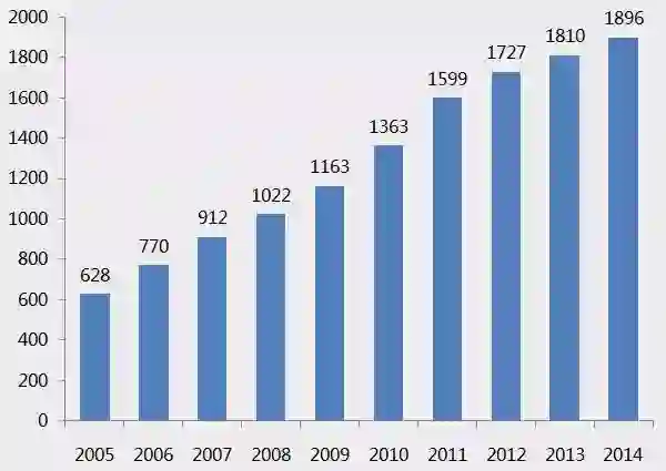 图:近十年数控机床企业数量稳步增长,2014年达到1896家