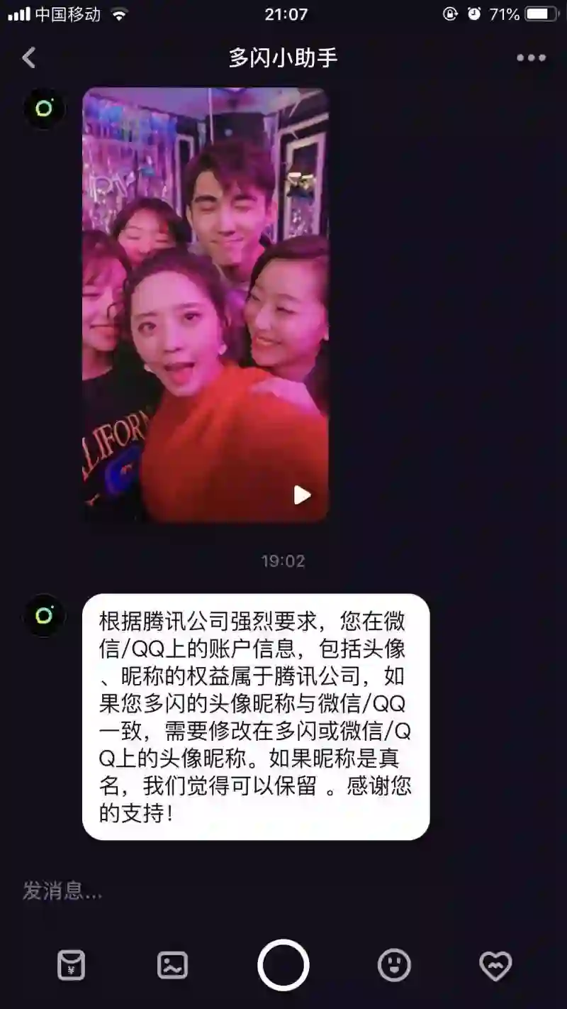今日晚间,字节跳动旗下社交产品多闪通过小助手向用户推送了一则消息,称“根据腾讯公司强烈要求,您在微信/QQ上的账户信息,包括头像/昵称的权益属于腾讯公司。如果您的多闪头像、昵称与微信/QQ一致,需要修改在多闪或微信上的昵称、头像。如果昵称是真名,我们觉得可以保留。感谢您的支持。
