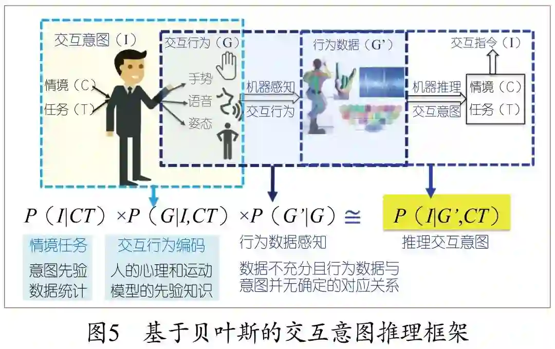 我们重点研究了能在较小样本中构建特征模型、模型参数一般又具有直接物理意义的贝叶斯方法,提出了基于贝叶斯推理的交互意图推理框架(图5),将任务-情境模型P(I|CT)和行为编码模型P (G|I,CT)作为先验知识代入贝叶斯推理,可以走出单纯依靠感知数据P(G'|G)进行交互语义识别所难以克服的数据不充分和数据-意图难对应的困境,可大幅提高意图识别P(I|G',CT)的准确性。与人机交互领域贝叶斯方法的应用相比,机器学习领域的贝叶斯方法的应用主要是在数据中发现知识,而人机交互则是在行为中发现知识。