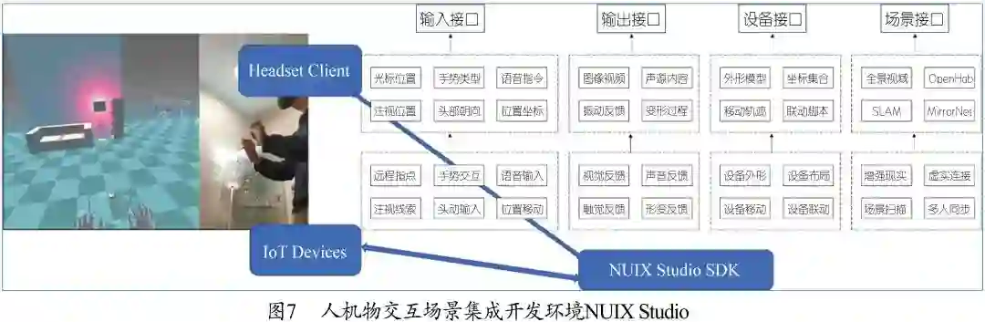 我们自20世纪90年代后期开始研究智能空间系统,在这种始终需要面对的工程难题中,探索并提出多用户混合现实同步交互控制方法,以混合现实方式连接虚拟呈现的场景设备与真实设备,并同步控制不同程度虚实融合的场景中多用户真实交互行为的一致性,在物理设备实现前后均可快速验证互联协议和交互能力。基于该方法,我们研制了人机物交互场景集成开发环境IDE,称为NUIX Studio,如图7所示,其虚实融合场景中内置大量基础自然交互I/O控件、设备控件和场景工具等多层次API支持,通过同步交互控制方法将同地或异地的多用户连接进入场景进行交互体验、测试和快速迭代,虚实融合方式大大降低了场景交互的开发难度,并可在完整物理实现交互场景前进行超前验证,同时,应用众包开发技术复用更多的工程资源,显著提升场景开发的扩展性。