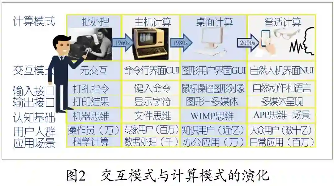 如图2所示,由于交互接口的变革,人机关系发生了重大变化,计算机越来越好用,从20世纪80年代开始,GUI的出现,带来了所见即所得的图形化直观呈现和鼠标的直接操控,较之前的字符用户界面(Character User Interface,CUI),也称为命令行界面(Command Line Interface,CLI)的形式语言命令,极大减轻了复杂性、抽象性、记忆负荷重对用户的限制,计算机应用得以普及,走出实验室和机房,走向办公室和家庭;新世纪,计算机用户多半都不曾用过鼠标等交互工具,直接用手与触屏交互——这是抛弃专门的交互设备、离开特设的工作台面后的又一次革命,可以将计算机握在手中、随时可用。正是由于交互模式的变革,计算机得以从卧在机房、立在桌上、握在手中到戴在身上和融入环境,计算无所不在。