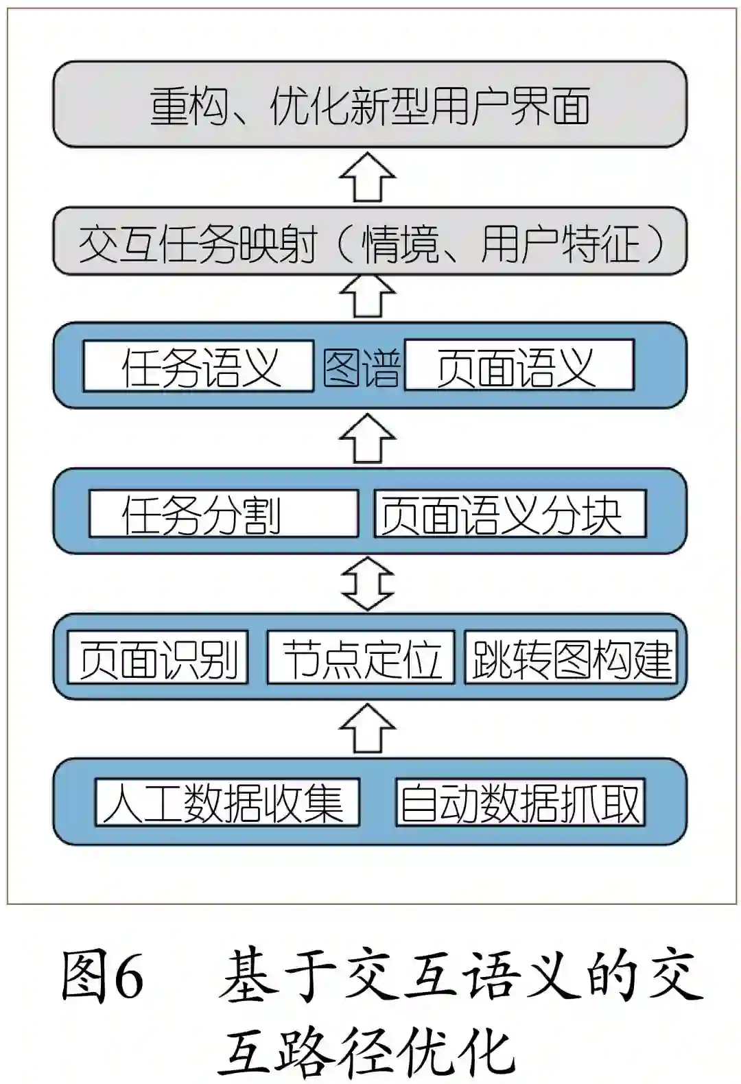 交互任务及其语义的获得,实践上可以充分利用已经有十多年广泛应用的移动互联网所产生的近千万个应用所携带的交互任务,这就是我们长期开展的界面语义理解工作,称为NUI Manager,如图6所示的下面四层,自动地实现界面元素的分割和基于逻辑层次的自动组织,从无结构的像素信息和移动设备渲染界面的布局信息生成用户理解界面的逻辑结构信息(从Framework层直接获取界面信息和交互数据),利用计算机视觉和自然语言处理技术从界面的图像上自动识别出界面控件和操作路径等,并为其增加语义描述。