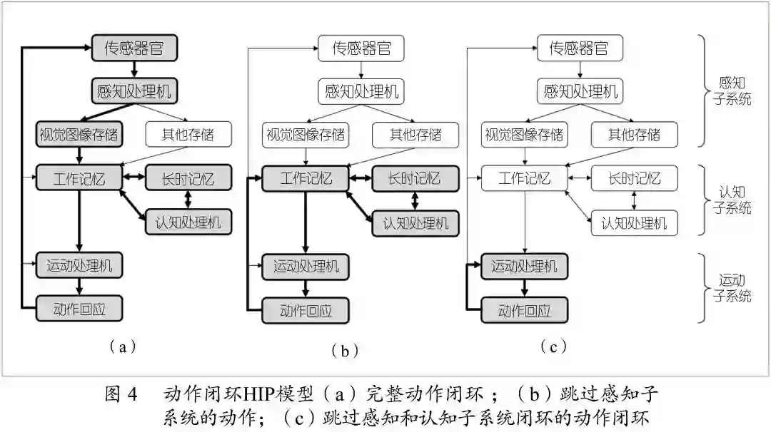 如图4(a)所示,一个完整的动作闭环会经历感知、认知和运动三个子系统对应的信息处理阶段,其中运动子系统的信息来源一般依赖于认知子系统,认知子系统的信息来源一般依赖于感知子系统。同时,人体在做出动作回应后,一般会重新回到下一个动作闭环的感知阶段,形成一个完整的闭环。
