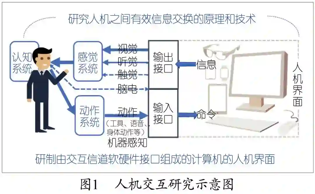 人机交互(Human Computer Interaction,HCI)研究人与计算机系统之间自然高效信息交换的原理与技术,实现为由多种模态的输入输出软硬件接口所构成的用户终端界面,形成特定的交互模式。如图1所示,接口分为用户输入数据处理的输入接口和机器处理结果反馈的输出接口。人的交互意图在脑中产生,今天的生命科学和脑电技术尚不能实现直接读脑写脑(图1中表示为虚线),交互意图需要通过外周神经系统下的行为动作表达出来,可以是操控工具,也可以是语音和动作的自然表达,输入接口的主要任务是捕捉和处理人的外在行为;机器处理结果的呈现要符合人的感知认知特点。