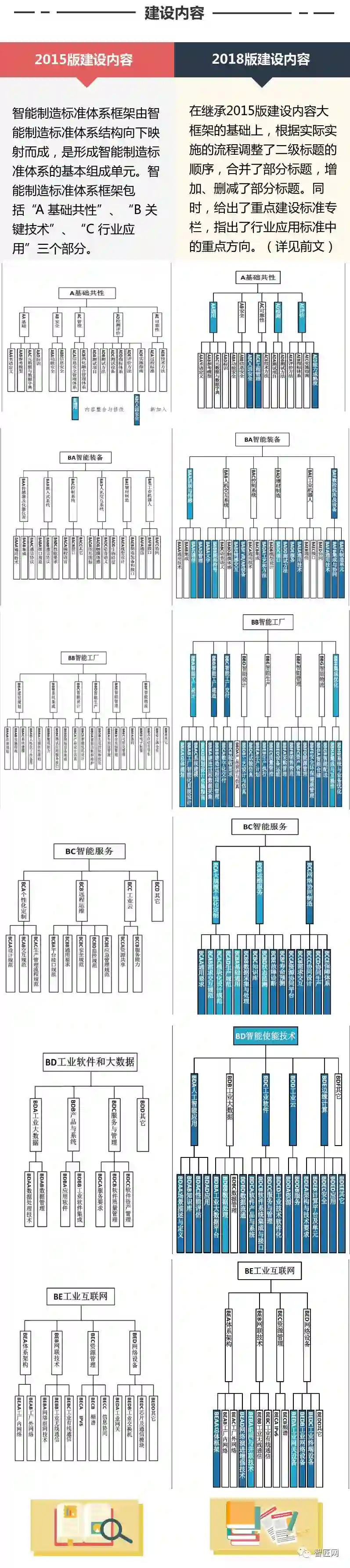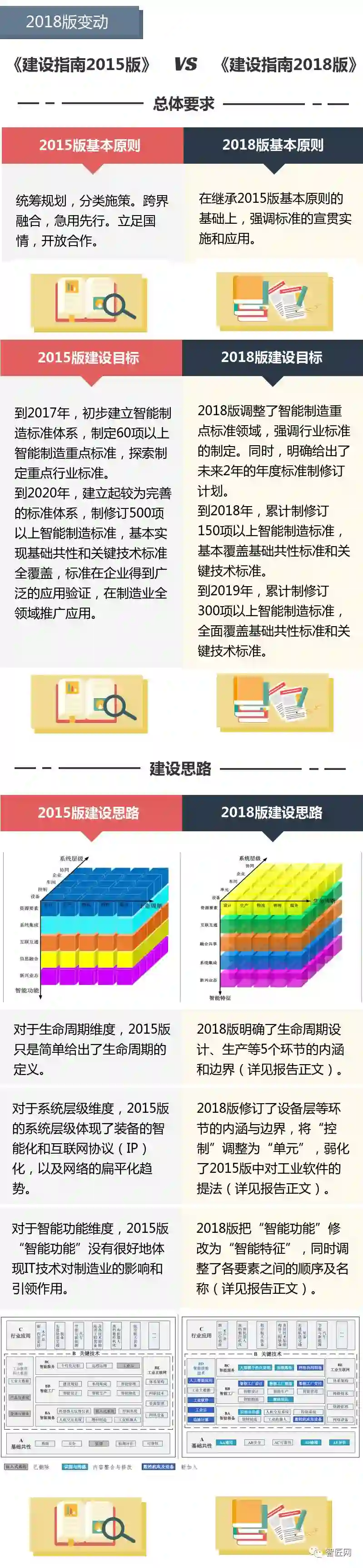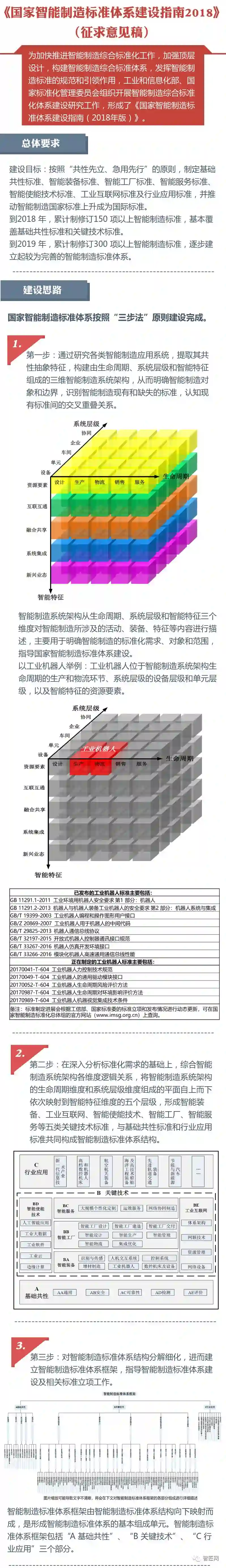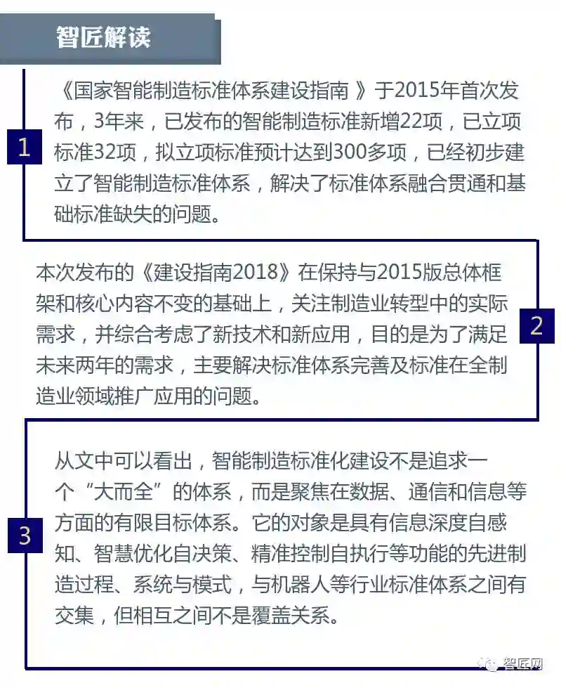工信部、国标委近日联合发布《国家智能制造标准体系建设指南(2018年版)》(征求意见稿),这是在《国家智能制造标准体系建设指南(2015年)》版本基础上的迭代,从智匠的梳理看来,标准体系结构基本维持原有框架,但在具体建设内容方面增进不少内容,值得业界人士关注。