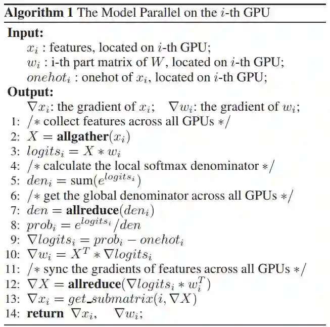 在没有使用并行模型的情况下,训练具有大量身份的模型比较困难,这受制于单一显卡的内存容量。softmax权重 矩阵存储存在瓶颈。打破瓶颈的一种最为直接的方法是将W划分为k个子矩阵w;因此,为了计算最终的softmax输出,每个GPU必须从所有其他GPU收集权重,因为权重在不同的GPU之间被分割。
