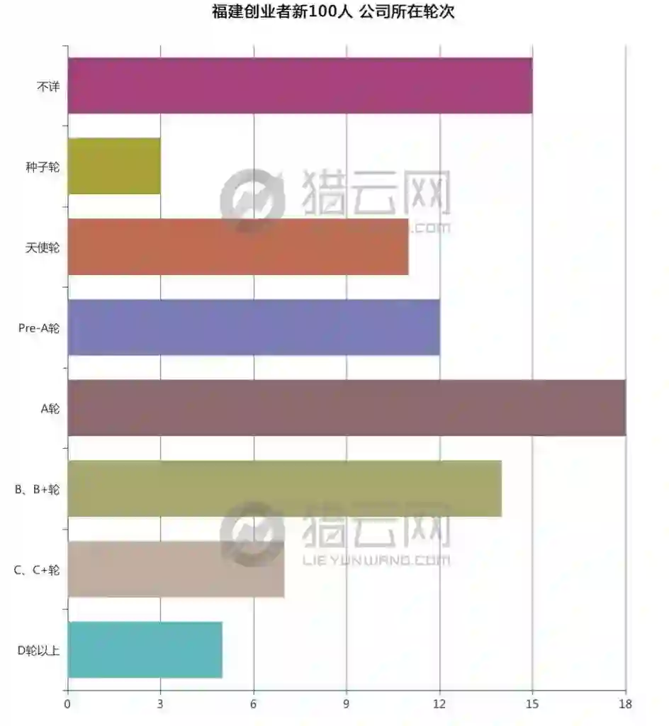 我们观察到,这100个创业者的100个公司,18%进入A轮。正处于茁壮期的创业公司,有相当的份额。而进入B轮以上的成熟公司,高达26个。在这福建创业者新100人,跑出4个主板公司、1个创业板公司、10个新三板公司。