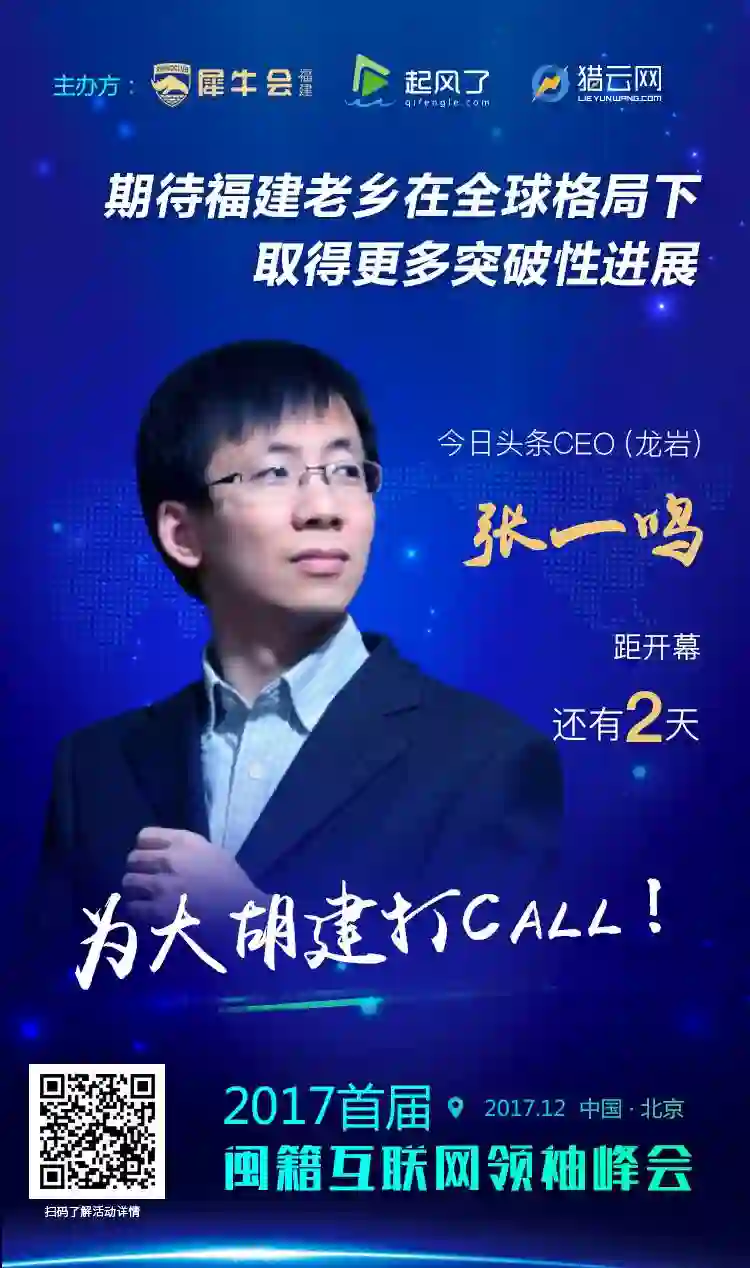 12月23日,闽籍创业群英将齐聚“为大胡建打CALL”首届互联网领袖峰会。此次峰会即将在京召开,千人规模,由犀牛会、起风了、猎云网共同主办。10+顶级闽籍行业大咖分享创投经验,30+闽籍创投机构鼎力支持,50+闽籍优秀创业者分享行业干货,20+闽籍主流媒体助阵,1000+闽籍互联网从业者聚力京城。本次峰会将会评选出“2017年度闽籍创业领军人物”、“2017年度闽籍新锐创业者”及“2017年度闽籍杰出投资人”奖项。