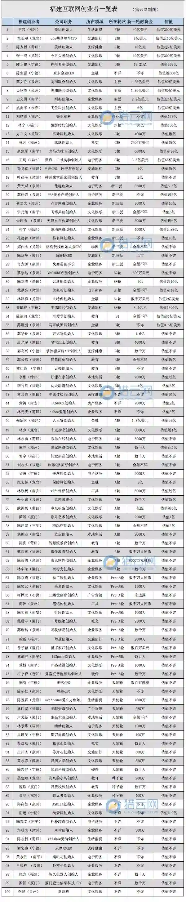 经过梳理,猎云网(微信号:ilieyun)挖掘了福建创业者新100人,数据仅供参考。