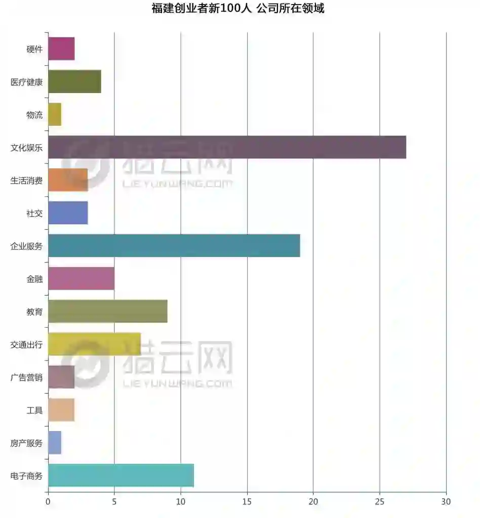 福建创业者新100人中,呈现出了创业新格局。27%的创业者,扎根文化娱乐创业领域,位居榜首。由此可见,福建创业者在文化娱乐领域、社交领域,抢到了风口,获得了一定的话语权。