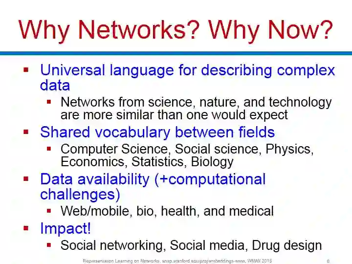 2018 年 4 月 23 日至 27 日,第 27 届国际万维网会议(26th International World Wide Web Conference) 在法国里昂举行。斯坦福大学SNAP组在WWW2018 上举办Tutorial介绍了网络表示学习的最近进展。专知小组整理分享给大家。