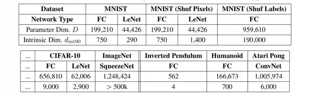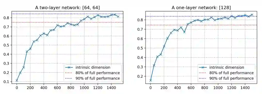 在内在维度度量的背后有一个直觉,那就是,因为参数空间具有这么高的维度,那么,利用所有维度来有效地学习有可能是不必要的。如果,我们只通过一片目标景观仍能学习一个好的解决方案,那么,所得的模型复杂性可能比通过参数计数所显示的复杂性更低。这本质上是内在维度试图评估的内容。