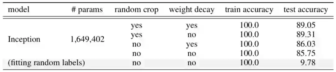 以在 CIFAR10 上训练的 Inception 模型为例(请参看图 5),正则化技术有助于样本外泛化,但不多。没有单一的正则化看起来是独立于其他项的关键。因此,正则化器不太可能是泛化的根本原因。