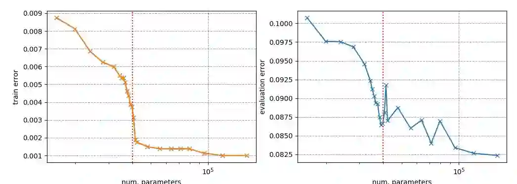 我没有为了获得完美的训练性能而对每个模型进行足够长时间的训练或调整,但是,评估误差的确显示在插值阈值周围有特别的扭曲,与训练误差不同。例如,对于 NMIST,阈值是训练样本的数量与类(10)的数量的乘积,即 4 万。
