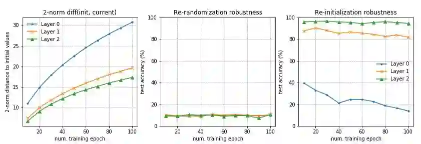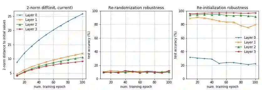 在全连接和卷积网络中可以观察到类似的模式。任何层的重新随机化完全破坏了模型的性能,因为预测马上变成了随机猜测。更有趣和令人惊讶的是,当应用重新初始化时,只有第一层或最前面的几层(那些最接近输入层的)至关重要,而重新初始化更高层不会导致性能下降。