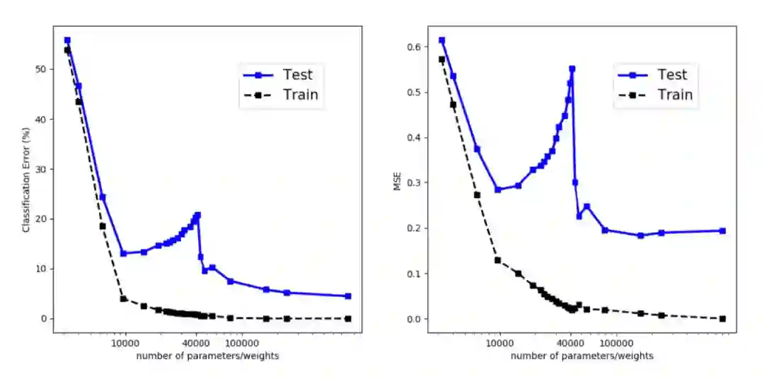 随着模型变得越来越大(添加了更多参数),训练误差减少到接近于 0,但是,一旦模型复杂度增加到超过“欠拟合”和“过拟合”之间的阈值,那么,测试误差(泛化误差)就开始增大。在某种程度上,这和奥卡姆剃刀完全一致。