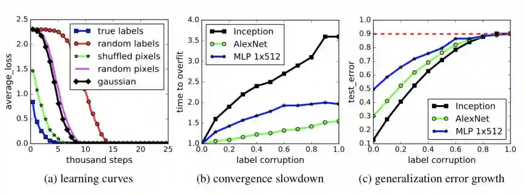 图 1。在 CIFAR10 上,用随机标签或随机像素拟合模型:(a) 学习曲线;(b - c) 标签损坏率是随机洗牌标签的百分比。(图像来源:Zhang 的论文)