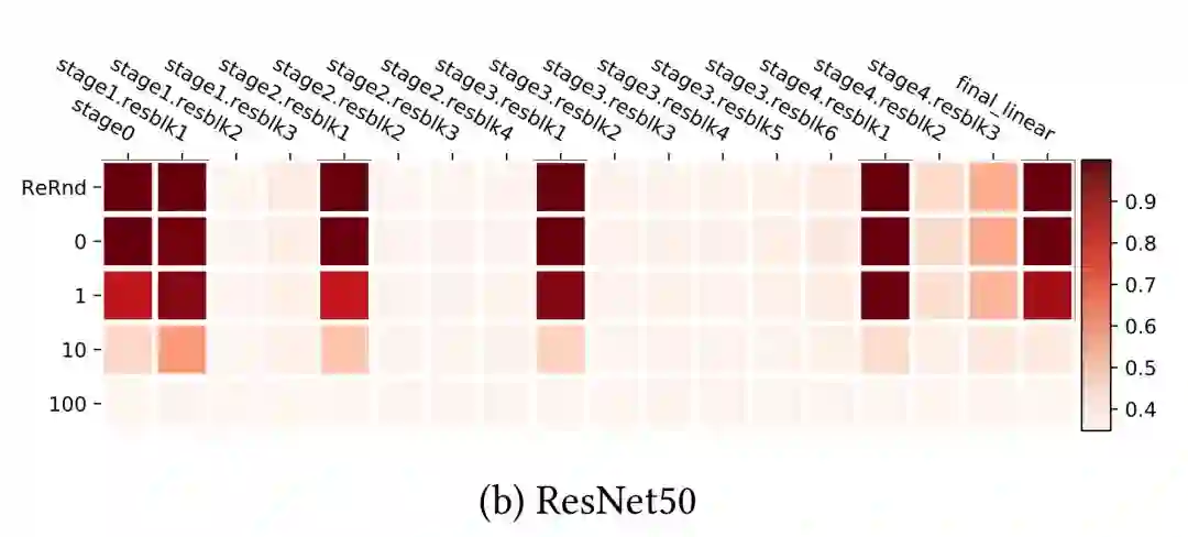 图 10。在 CIFAR10 上训练的 ResNet-50 模型的层重新随机化(第一行)和重新初始化(重置行)的稳定性。(图的来源:原始论文)