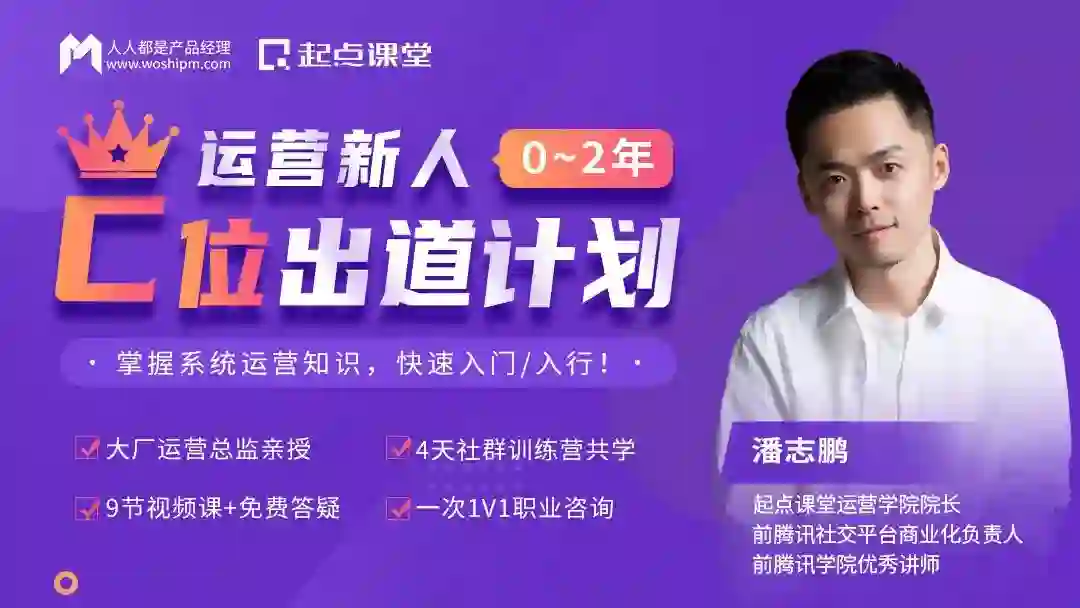 你好,我是潘至鹏,目前在一家500强企业负责运营团队的搭建和管理,同时也是起点课堂运营学院院长。