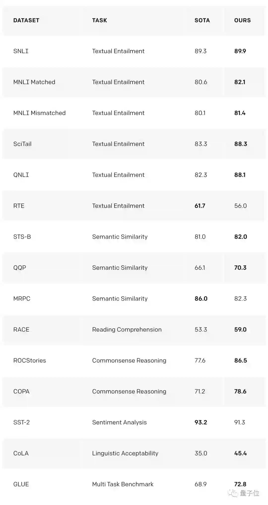 让我们感到尤其兴奋的结果,是这种方法在COPA, RACE和ROCStories三种数据集上的表现。这三种数据集为测试常识推理和阅读理解的表现而设计。
