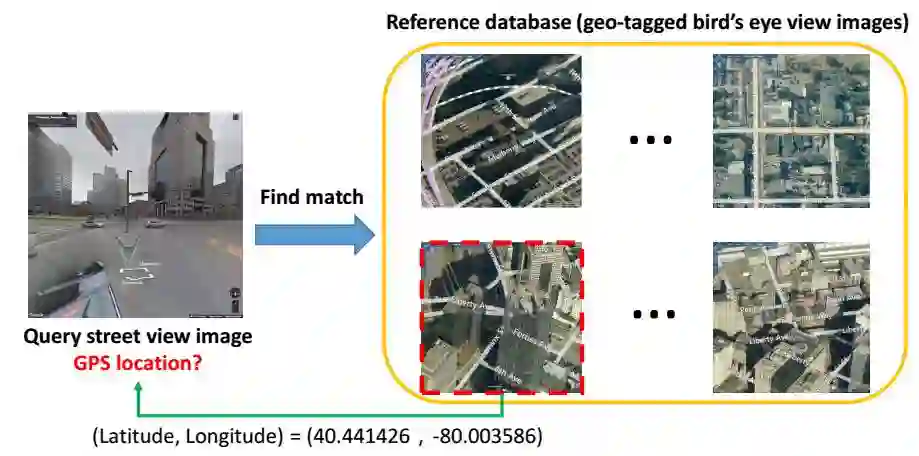 在本文中,作者旨在解决交叉视图地理定位问题。如下图所示,在带地理信息的鸟瞰图参考数据库中搜索匹配图像(图示右侧),来估计一幅街景视角的图像(图示左侧)所对应的GPS位置。